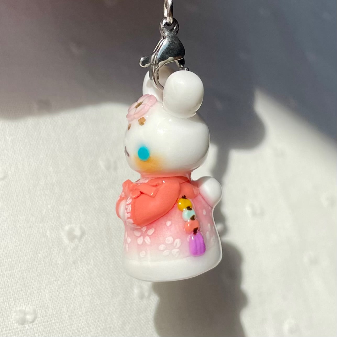 Thin Glaze(4 layers of fimo gloss varnish): Shiny but not smooth. Fragile (handle with care). Not fully waterproof. Keep away from water.
